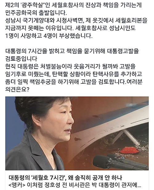 이 시장은 “현직 대통령은 처벌불능이라 웃음거리가 될까봐 고발을 임기후로 미뤘는데, 탄핵할 상황이라 탄핵사유를 추가하고 좀더 일찍 책임추궁을 하기 위해 고발을 검토한다”며 시민들의 의견을 물었다.