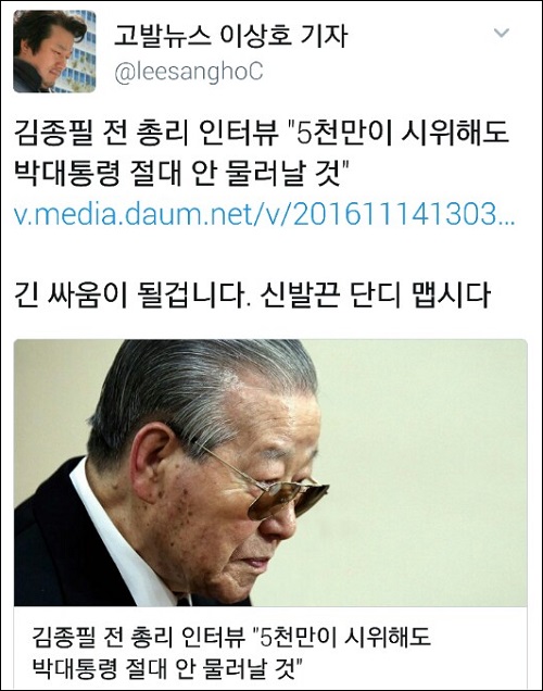 고발뉴스 이상호 기자도 트위터에 “5천만이 시위해도 박대통령 절대 안 물러날 것”이라는 제목의 기사를 공유하며 “긴 싸움이 될 겁니다. 신발끈 단디 맵시다”고 적었다.