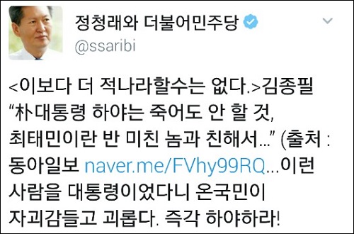 정청래 전 더불어민주당 의원은 “이보다 더 적나라할 수는 없다”며 “이런 사람이 대통령이었다니 온 국민이 자괴감 들고 괴롭다. 즉각 하야하라!”고 비판했다.