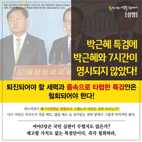 4. 여·야 3당이 공동으로 만든 이른바 ‘박근혜 특검법’이 많은 허점을 갖고 있다는 지적이 나왔습니다. 가장 큰 문제점으로는 ‘청와대 강제 압수수색 권한’ 조항이 없고, 수사대상에 박 대통령이 명시돼 있지 않아 세월호 참사 당일 7시간 행적 등에 대한 의혹도 제외될 것으로 보여 비판이 제기되고 있습니다.