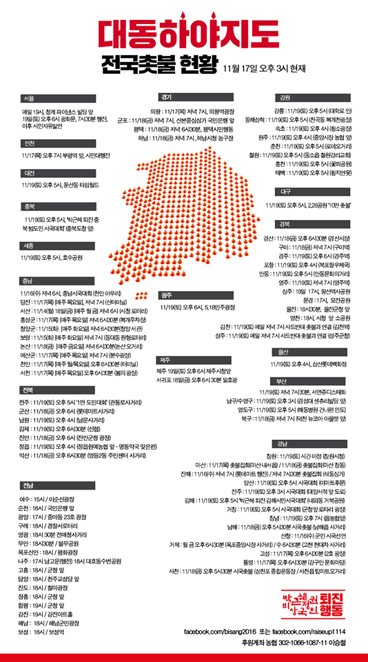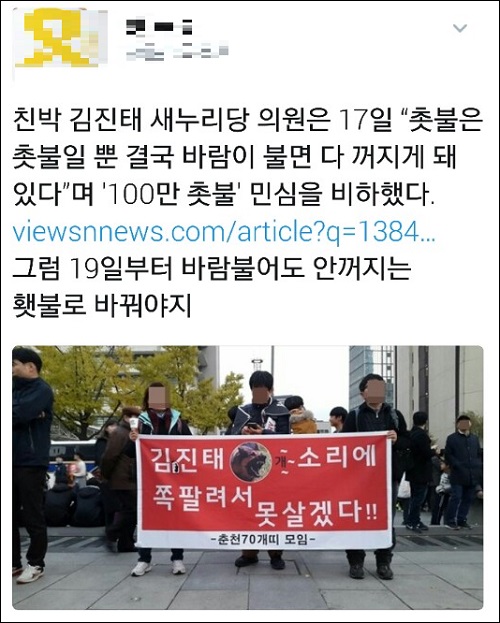 새누리당 김진태 의원이 “촛불은 촛불일 뿐, 결국 바람이 불면 꺼진다”고 말해 100만 촛불 민심에 기름을 부었다. SNS상에서는 지난주에 이어 이번 주말에는 200만이 모여 “박근혜 퇴진을 외치자”는 목소리가 일고 있다.