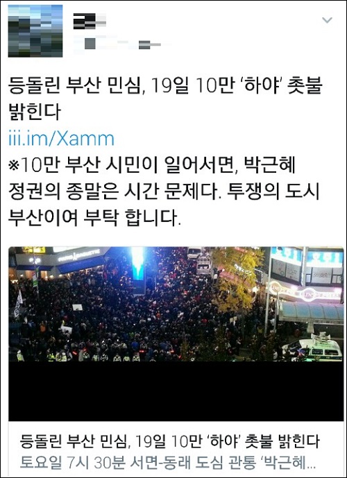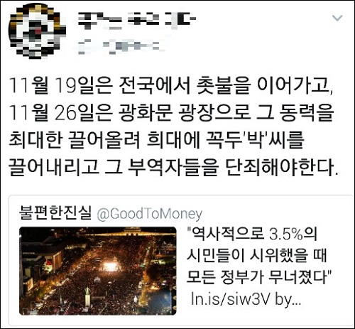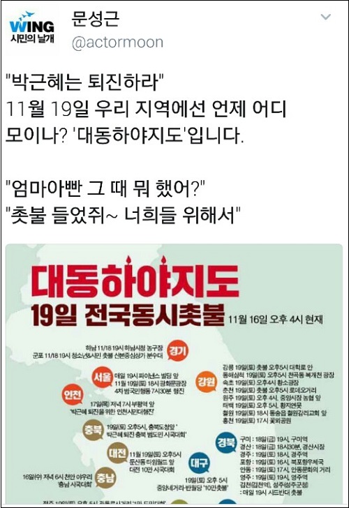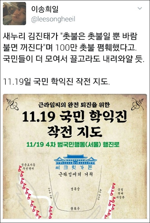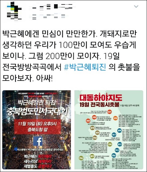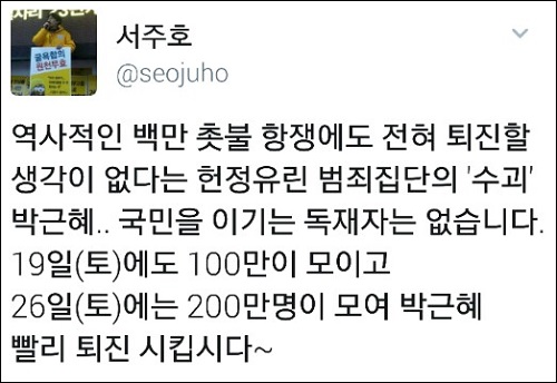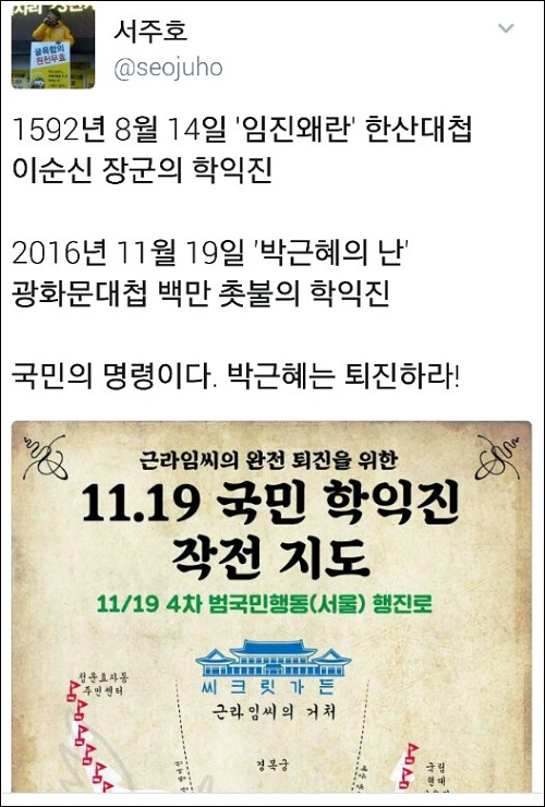 SNS “광화문대첩 백만 촛불의 학익진.. 박근혜 퇴진, 국민의 명령!”