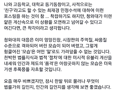 김 교수는 “청와대의 대응은 이미 엉망진창, 시장판의 주먹질, 싸움질 수준으로 격하되어 버린 모습이 되어 버렸다”며 “천박한 법률지식과 법적 ‘절차’에 대한 미시적 유불리 계산을 내세워 인간과 제도의 ‘품격’은 아랑곳하지 않는 모습은 더욱 거센 후폭풍을 자초할 것”이라고 경고했다.