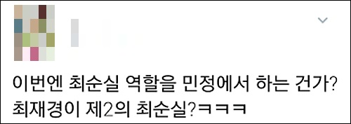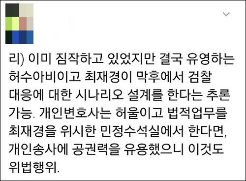 홍성태 상지대 교수도 “근혜순실 범죄의 변호에도 근혜순실 범죄의 수법이 그대로 사용되는 셈”이라며 “A행정관과 민정수석실도 수사대상”이라고 비판했다.