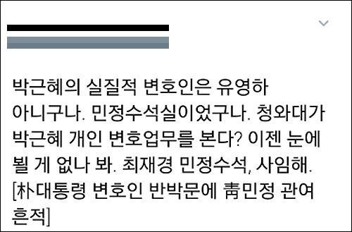 “사적으로 국가조직을 쓰지 마라 박근혜 피의자!”, “박근혜의 실질적 변호인은 유영하 아니구나. 민정수석실이었구나”, “청와대가 박근혜 개인 변호업무를 본다? 이젠 눈에 뵐 게 없나 봐. 최재경 민정수석, 사임해”, “대한민국을 삼류국가도 아닌 사류국가로 전락시켰군요”, “피의자를 왜 민정수석실에서 변호를 도와주냐” 등의 의견이 이어졌다.