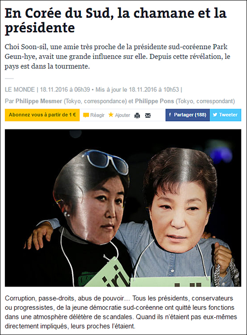 필립 메스메르와 필립 퐁스 등 도쿄의 두 특파원은 <한국, 무당과 대통령>이라는 제목의 기사를 통해 박근혜 대통령이 절친 최순실에 의해 조종됐던 스캔들이 밝혀진 이후 나라 전체가 공황 상태에 빠졌다고 보도했다.