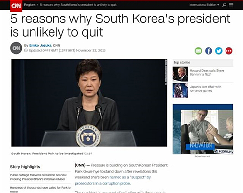 4. 미국의 CNN은 ‘박 대통령 퇴진을 요구하는 대규모 시위가 잦아들 기미가 보이지 않고 있지만, 전문가들은 대통령의 사임 가능성을 낮게 본다’고 보도하며 그 5가지 이유를 분석했습니다. 1)헌법상 대통령의 불소추특권 2)권력 후계자가 없다 3)여당내의 출당압력이 약하다 4)힘 약한 야권 5)혈통이라고 합니다.