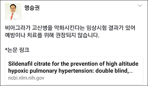 명승권 국제암대학원대학교 암관리정책학과 교수는 페이스북에서 “비아그라가 고산병을 악화시킨다는 임상시험 결과가 있어 예방이나 치료를 위해 권장되지 않는다”며 관련 논문을 소개했다.