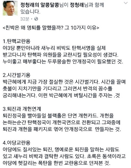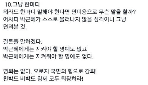 속내를 하나하나 써내려간 정 전 의원은 결론적으로 “박근혜에게는 지켜야 할 명예도 없고, 박근혜에게는 지켜줘여야 할 명예도 없다”며 “명퇴는 없다. 오로지 국민의 힘으로 강퇴! 친박도 비박도 함께 모두 퇴장하라”고 일갈했다.