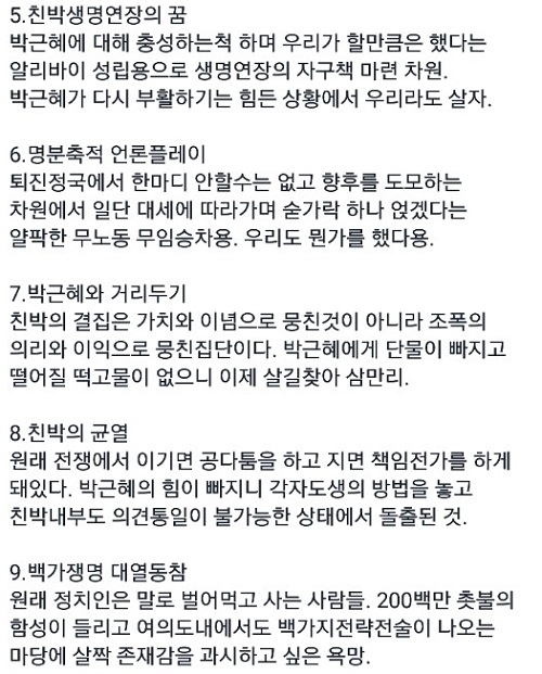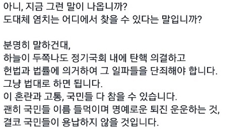 이어 “그런데, 국민들 고생이 이만저만이 아니니 이제라도 대통령 물러나면 이승만식 해법이니 헌법 조항인 사면이니, 그게 나라와 국민 위하는 길이라고 조용히 그러나 목에 힘주고 얘기들 한다”며 여당 내부에서 은밀하게 타협안이 제시되고 있음을 시사하기도 했다.