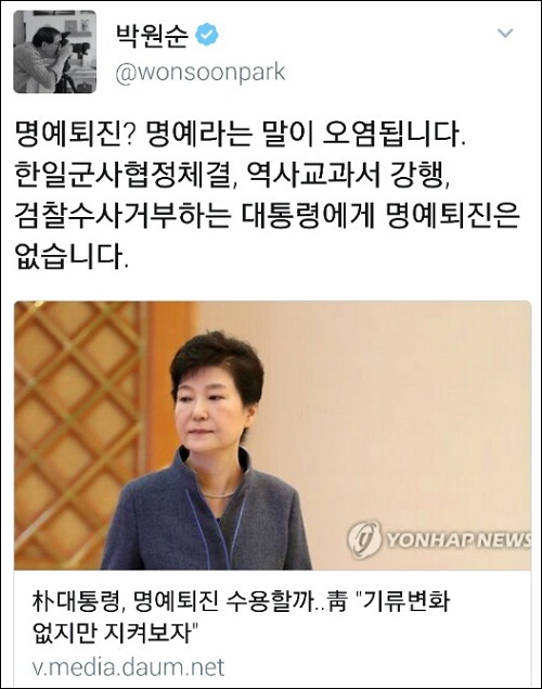 박원순 서울시장도 “명예퇴진? 명예라는 말이 오염된다”며 “한일군사협정체결, 역사교과서 강행, 검찰수사 거부하는 대통령에게 명예퇴진은 없다”고 잘라 말했다.
