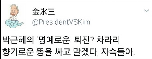 그런가하면 파워트위터리안 김빙삼 씨는 “박근혜의 ‘명예로운’ 퇴진?”이라고 반문하며 “차라리 향기로운 똥을 싸고 말겠다”고 힐난했다.