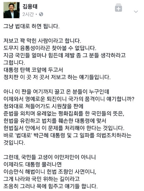 김 의원은 “청와대로 쳐들어가도 시원찮을 판에 준법을 외치며 유례없는 평화집회를 한 국민들의 뜻은, 헌법을 유린하고 법치를 훼손한 대통령에 맞서 헌법질서 안에서 이 문제를 처리해야 한다는 것”이라며 “바로 ‘법대로’ 박근혜 대통령 및 그 일파를 의법 조치하라는 것”이라고 꼬집었다.
