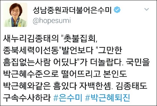 그런가하면 은수미 전 의원은 “‘촛불집회, 종북세력이 선동’ 발언 보다 ‘그만한 흠집 없는 사람 어딨냐’가 더 놀랍다”면서 “국민을 박근혜 수준으로 떨어뜨리고 본인도 박근혜와 같은 흠있다 자백한 셈. 김종태도 구속수사하라”고 꼬집었다.