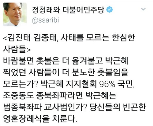 정청래 전 의원은 트위터를 통해 “김진태-김종태, 사태를 모르는 한심한 사람들”이라며 “바람 불면 촛불은 더 옮겨 붙고 박근혜 찍었던 사람들이 더 분노한 촛불임을 모르는가?”라고 질타했다.