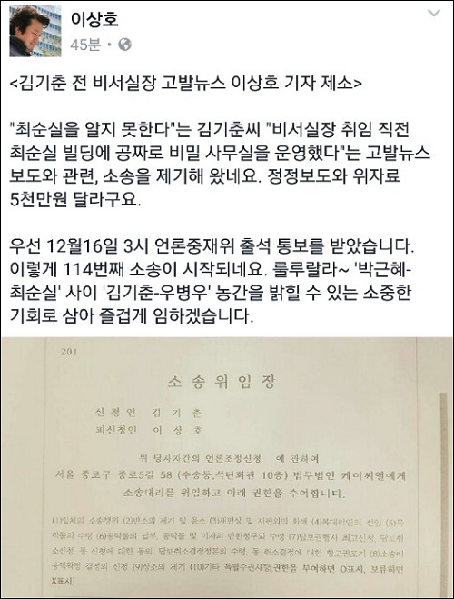 이에 이상호 기자는 30일 페이스북을 통해 “우선 12월16일 3시 언론중재위 출석 통보를 받았다”며 “이렇게 114번째 소송이 시작된다”고 알렸다. 이 기자는 이어 “룰루랄라~‘박근혜-최순실’ 사이 ‘김기춘-우병우’ 농간을 밝힐 수 있는 소중한 기회로 삼아 즐겁게 임하겠다”고 114번째 소송에 대한 소회를 밝혔다.