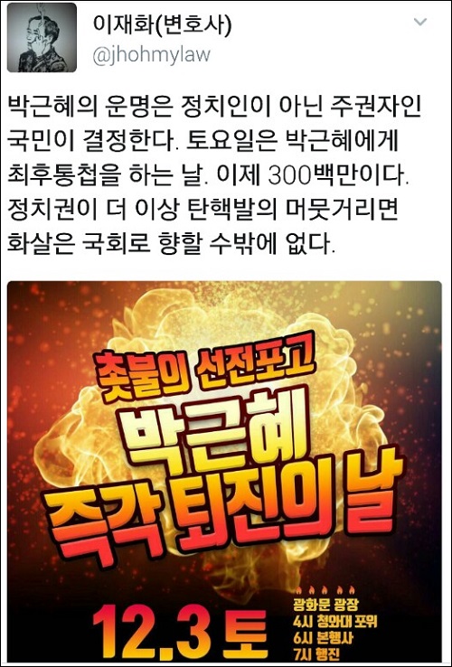 ‘민주사회를 위한 변호사 모임’ 이재화 변호사는 “박근혜의 운명은 정치인이 아닌 주권자인 국민이 결정한다”며 “토요일은 박근혜에게 최후통첩을 하는 날. 이제 300만이다. 정치권이 더 이상 탄핵발의 머뭇거리면 화살은 국회로 향할 수밖에 없다”고 경고했다.