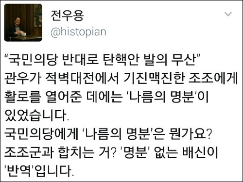 SNS상에서도 성토가 잇따랐다. 국민의당의 반대로 ‘박근혜 탄핵안’ 2일 처리가 무산된 데 대해 역사학자 전우용 씨는 “관우가 적벽대전에서 기진맥진한 조조에게 활로를 열어준 데에는 ‘나름의 명분’이 있었다”면서 “국민의당에게 ‘나름의 명분’은 뭔가요? 조조군과 합치는 거? ‘명분’ 없는 배신이 ‘반역’”이라고 맹비난했다.