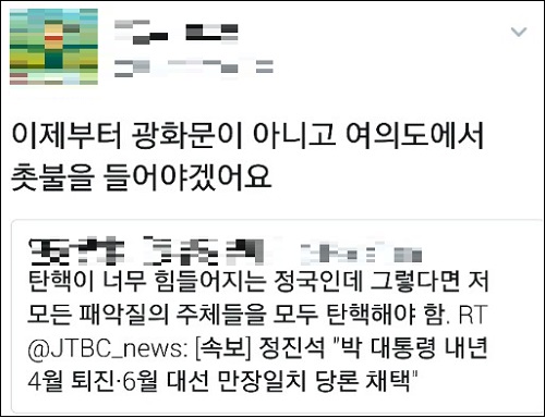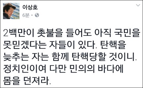 고발뉴스 이상호 기자는 “2백만이 촛불을 들어도 아직 국민을 못믿겠다는 자들이 있다”며 “탄핵을 늦추는 자는 함께 탄핵당할 것이니. 정치인이여 다만 민의의 바다에 몸을 던져라”고 주문했다.