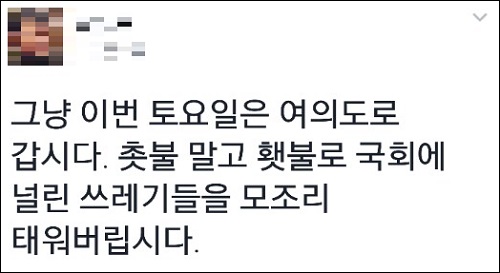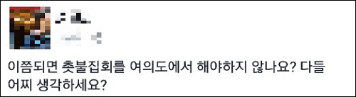 오는 3일 ‘박근혜 즉각 퇴진의 날’이란 이름으로 ‘박근혜 퇴진 6차 촛불집회’가 예정돼 있는 가운데, 이번 주말에는 광화문이 아닌 여의도에서 촛불을 들어야 한다는 목소리도 나오고 있다.