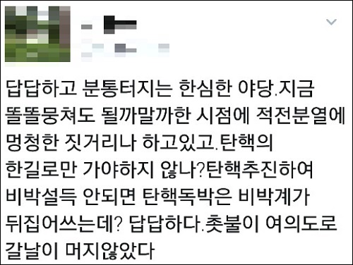 이어 “탄핵추진 때부터 비박계 눈치를 보며 캐스팅보트를 쥐어주더니, 결국 뒤통수 맞았다”며 “즉각 퇴진을 요구하는 민심과 함께 하는 것이 지금 야당의 당론이어야 한다”고 촉구했다.