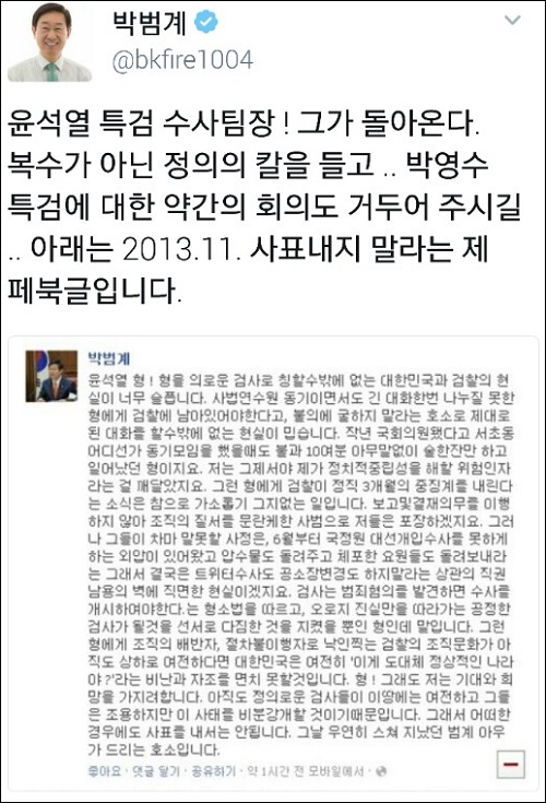윤석열 검사의 특검 합류 소식이 전해지자 SNS에서는 지난 2013년 10월 서울고등검찰청에서 열린 국회 법제사법위원회 국정감사에서 윤석열 검사가 윗선의 수사 축소 압력을 폭로하던 순간을 담은 영상이 재공유 되고 있다.