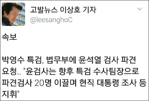 ‘박근혜 게이트’를 수사할 박영수 특별검사가 윤석열 대전고검 검사를 수사팀장으로 파견해 줄 것을 법무부와 검찰에 요청했다. 윤 검사는 당초 특검 합류 요청을 고사한 것으로 알려졌다. 하지만 박 특검의 거듭된 요청에 마음을 돌린 것으로 전해졌다.