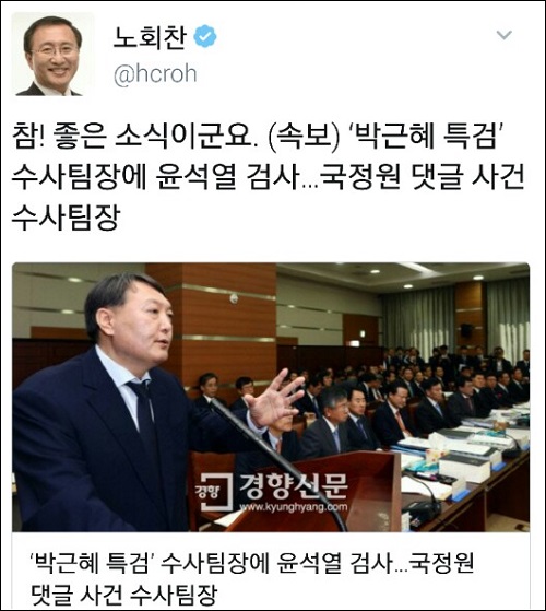윤 검사는 ‘국정원 댓글사건’ 특별수사팀장을 맡았다가 검찰 수뇌부의 반대를 무릎 쓰고 국정원 전 심리전단 직원들에 대한 압수수색과 체포영장을 집행, 특별수사팀에서 배제되는 등 ‘좌천성 인사’를 당했다.