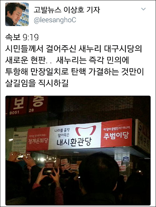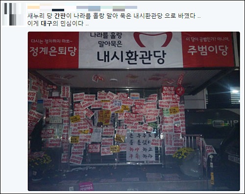 한편 SNS에서는 전날 분노한 대구 시민들이 새누리당 대구 경북도당의 간판을 교체한 사진과 영상이 화제다.