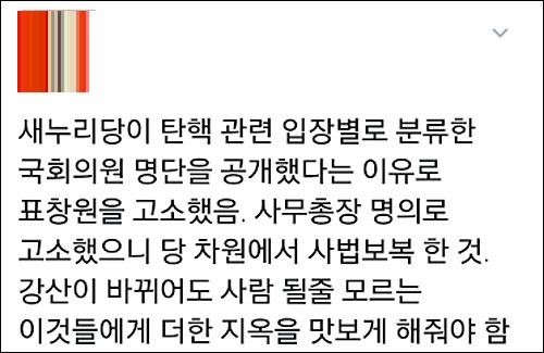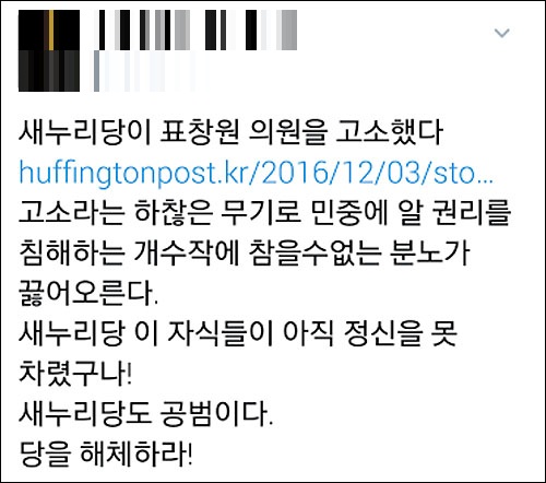 전국 232만명이 촛불집회에 참여하고 전국 곳곳에서 횃불이 등장하고 있는 가운데 새누리당이 대통령 탄핵 찬반 의원 명단을 공개한 표창원 더불어민주당 의원을 검찰에 고소했다.