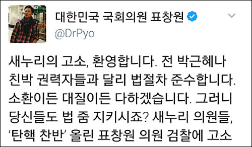 피소된 표 의원은 SNS를 통해 “새누리의 고소, 환영한다”며 “전 박근혜나 친박 권력자들과 달리 법절차 준수한다, 소환이든 대질이든 다하겠다”고 밝혔다. 그러면서 표 의원은 “그러니 당신들도 법 줌 지키시죠?”라고 꼬집었다.