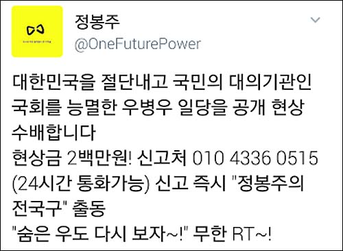 정봉주 전 의원은 “대한민국을 절단내고 국민의 대의기관인 국회를 능멸한 우병우 일당을 공개 현상 수배한다”며 “현상금 2백만원! 신고처 010 4336 0515”이라고 밝혔다.