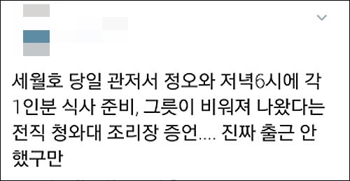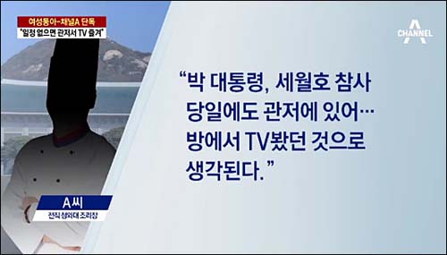 세월호 참사 당일에 대해선 박 대통령이 평소처럼 혼자 관저에서 점심과 저녁을 먹었다고 주장했다. A씨는 “직접 본 건 아니다”면서도 “점심과 저녁 식사 시간에 1인분의 음식이 들어갔고 그릇이 비워져 나왔다는 건 확실하다”고 말했다.