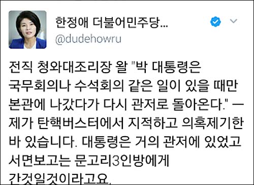 이재정 원내대변인도 “보안손님이 실세비서관들에게 지시를 내리고 있을 때, 대통령은 홀로 TV를 보고 있었다는 것”이라며 “국민이 얼굴 들기가 힘들다”고 비판했다.