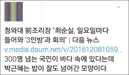 해당 내용에 SNS에서는 “기가 막히다”, “최순실이 대통령이었구만”, “딴 의혹 다 제쳐두고 이거 하나만으로 파면감 아니냐?”, “그럼 아이들이 가라 앉는 걸 보면서 점심 식사를 했다는 건가”, “완전 허수아비구나, 3인방과 순실이가 국정운영을 했다는 거네”, “그냥 밥이나 축내는 허수아비였다니”, “아이들 수장 되어 가는데 목구멍으로 밥이 들어가더냐”,