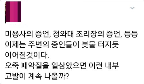 또 문고리 3인방은 최씨가 돌아간 후 각자 따로 밥을 먹었다며 밤 10시~11시경이 되서야 정리할 수 있었다고 말했다. 아울러 최순실씨는 관저에서 나갈 때 꼭 김밥을 싸달라고 했다고 증언했다.