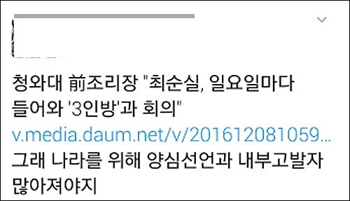여성동아에 따르면 전직 청와대 조리장 A씨는 박근혜 대통령 임기 초 최순실씨가 매주 일요일 청와대 관저에 들어와 ‘문고리 3인방’과 회의를 했다고 말했다. A씨는 2008년부터 올해 7월까지 대통령들의 식사를 담당했다.
