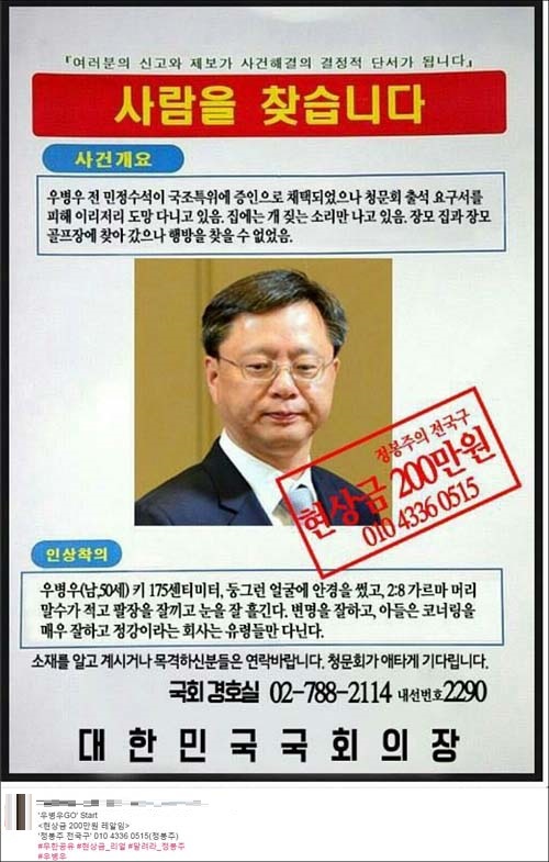 12. 우병우 전 민정수석에게 정봉주 전 의원과 안민석 의원이 각각 500만 원, 김성태 새누리당 의원이 100만 원 등 총상금 1,100만 원이 걸렸습니다. 정봉주 전 의원이 ‘우병우 일당을 공개 현상 수배합니다’라며 현상금 200만 원을 내건 이후 사흘 만에 현상금을 1000만 원으로 올렸습니다.