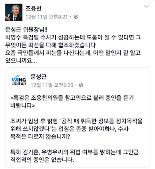조 의원은 11일 페이스북에서 문성근 시민의날개 이사의 “특검은 조응천 의원을 참고인으로 불러 증언을 듣기 바란다”는 제안에 이같이 밝혔다.