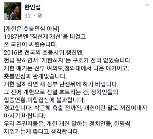 이어 “박근혜 축출 전까진, 개헌이란 말도 끄집어내지 말라”고 경고하며 “우리 주권자들은 개헌, 개헌 말하는 정치인들을, 마음에서 쓱쓱 지워가는 게 좋겠다”고 덧붙였다.