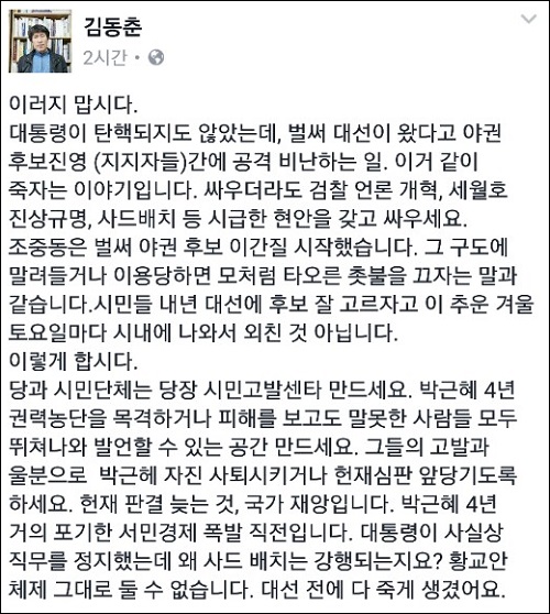 성공회대 김동춘 교수(사회학과)는 “대통령이 탄핵되지도 않았는데, 벌써 대선이 왔다고 야권 후보진영(지지자들)간에 공격 비난하는 일. 이거 같이 죽자는 이야기”라며 “이러지 말자”고 당부했다.