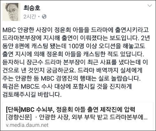 15일 <경향신문>은 “MBC 수뇌부가 ‘비선실세’ 정윤회씨의 아들인 배우 정우식씨를 드라마에 출연시키도록 현장 제작진에 여러 차례 청탁을 넣었던 것으로 드러났다”며 “정씨에 특정 배역을 주라고 지시해 100명 넘는 연기자들이 응시한 오디션이 쓸모없어진 적이 있었다는 증언도 나왔다”고 보도했다.