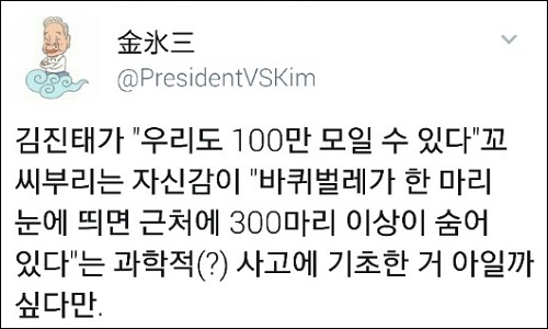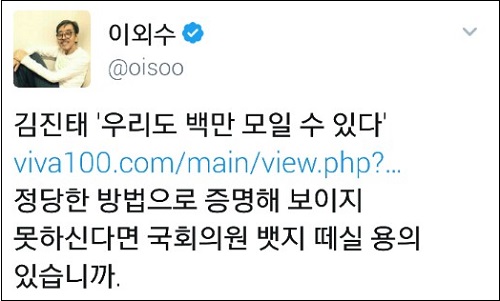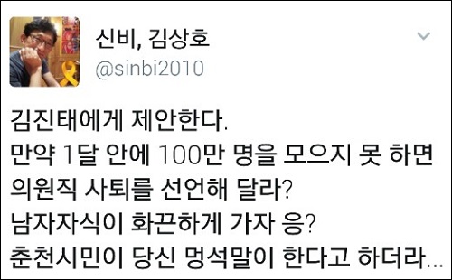 또 공무원U신문 김상호 기자는 “김진태에게 제안한다. 만약 한달에 100만 명을 모으지 못하면 의원직 사퇴를 선언해 달라? 남자자식이 화끈하게 가자 응? 춘천시민이 당신 멍석말이 한다고 하더라”고 힐난했다.