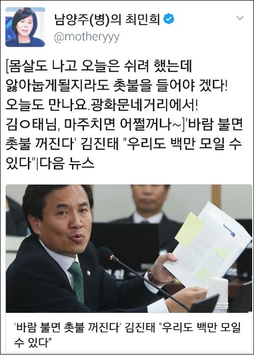 그런가하면 최민희 더불어민주당 전 의원은 “몸살도 나고 오늘은 쉬려 했는데 앓아눕게 될지라도 촛불을 들어야겠다”며 “오늘도 광화문 네거리에서 만나자”고 덧붙였다.