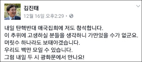 전날 김진태 의원은 자신의 페이스북에 “이 추위에 고생하실 분들을 생각하니 가만있을 수가 없다”면서 “머릿수 하나라도 보태야겠다. 우리도 백만 모일 수 있다”고 적었다.