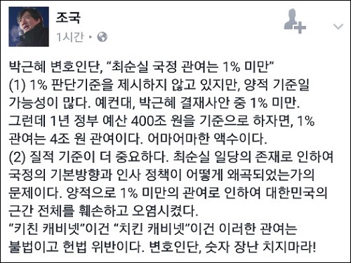 박 대통령 측의 이 같은 주장에 조국 서울대 법학전문대학원 교수는 “1% 판단기준을 제시하지 않고 있지만, 양적 기준일 가능성이 많다”면서 “예컨대, 박근혜 결재사안 중 1% 미만. 그런데 1년 정부 예산 400조 원을 기준으로 하자면, 1% 관여는 4조 원 관여이다. 어마어마한 액수”라고 지적했다.