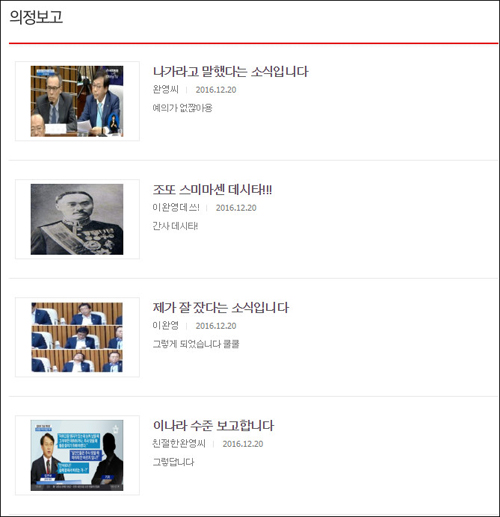한편 네티즌들의 항의문자와 ‘18원 후원금’을 다량 받고 있는 이완영 의원은 이번에는 홈페이지 게시판 글 세례를 받았다.