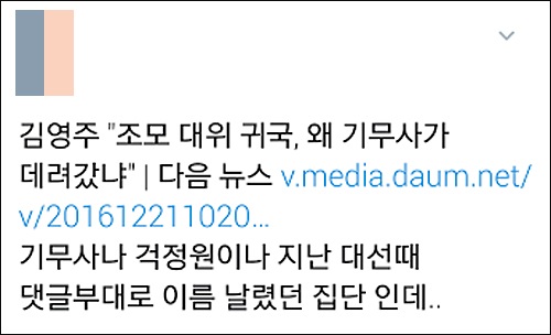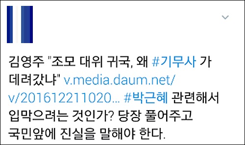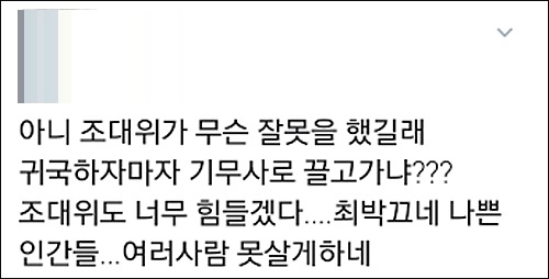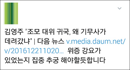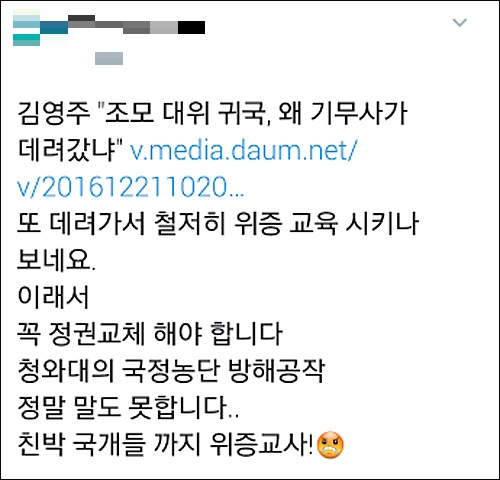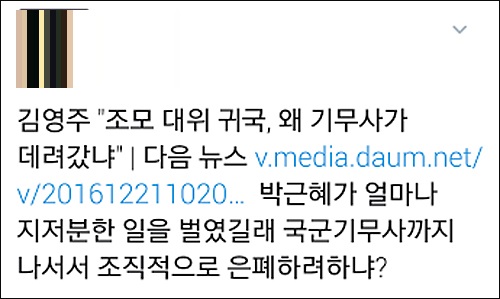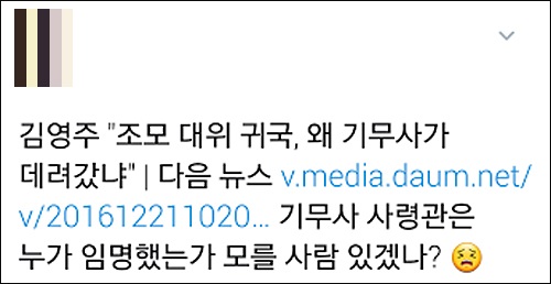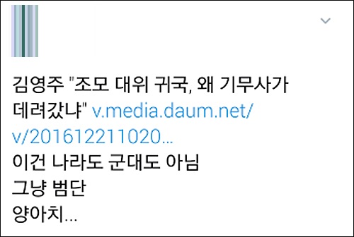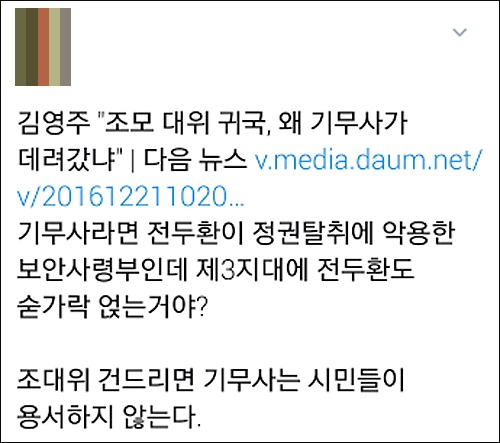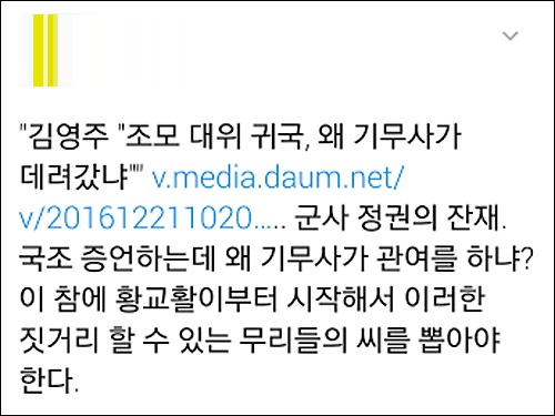 청문회 위증교사 의혹이 불거진 상황에서 정보기관이 증인을 데려갔다는 사실에 SNS에서는 “지금 가장 중요한 참고인의 증언을 방해하려고 하는 거여?”, “어떻게 증언할 지 입 맞추고 대책회의하는 거겠지”, “위증교사 및 위증하는 자들은 최소 10년 이상 중형에 처해야 한다”, “민간인은 국정원. 군발이는 기무사. 조작과 공작의 중심기관”, “조대위 건드리면 기무사는 시민들이 용서하지 않는다”,