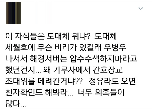 앞서 신보라 전 간호장교는 14일 3차 청문회에서 세월호 당시 의무실에서 근무했다며 당일 박근혜 대통령에게 의료용 가글을 전달했다고 말했다. 이에 손혜원 민주당 의원은 “의료용 가글은 필러 시술 후 입이 마비가 돼 양치를 못할 때 사용한다고 한다”고 의혹을 제기한 바 있다.