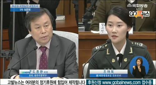 도종환 더불어민주당 의원은 조 대위에게 “앞서 이선우 청와대 의무실장이 태반‧백옥‧감초주사를 박근혜 대통령에게 처방했다고 말했는데 직접 주사를 놓은 사람은 조여옥 대위인가”라고 물었다.